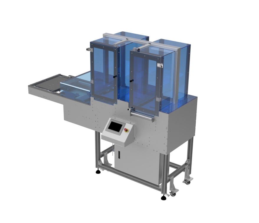 The machine is designed for one tray size according to your needs. Multiple product specific trays can be used if the outer dimension and shape are common. Different tray heights can be handled with optional motorized lift units.