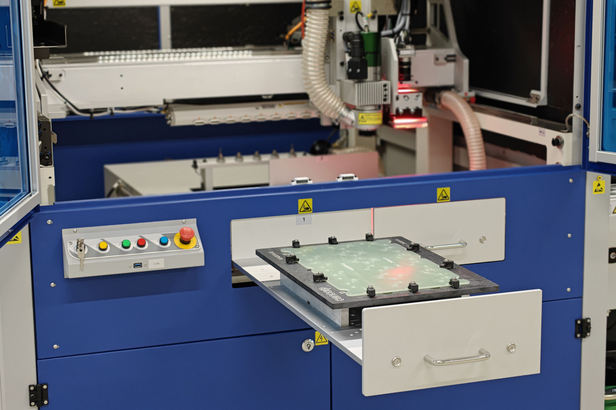The machine can be equipped with a rotary table that offers minimal footprint, or with a dual drawer setup for maximum flexibility. Dual drawers enable the possibility to combine both drawers into one fixture that can process very large panels. Both the rotary and dual drawers are designed with an operator load/unload station that presents the product directly in front of the operator, thereby reducing operator fatigue and physical stress.